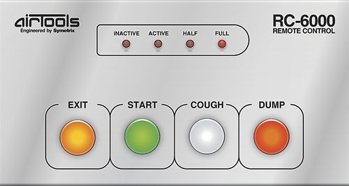 Die RC-6000-Fernbedienung von AirTools ist eine Zubehör-Fernbedienung, mit der Produzenten oder On-Air-Talente die Hauptfunktionen der 6000- oder 6100-Rundfunk-Audioverzögerungen steuern können, darunter Exit, Start, Cough und Dump. Die Fernbedienung zeigt außerdem den aktuellen Status des Delays an: Inaktiv, Aktiv, halber Delay-Speicher und voller Delay-Speicher.Spezifizierungen