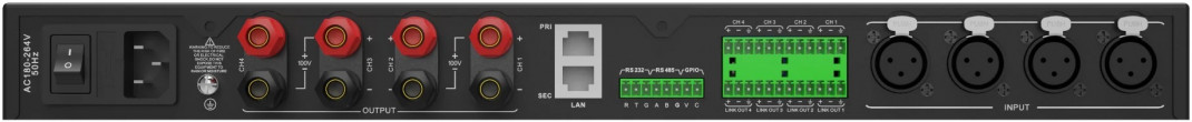 Netzwerk-DSP-Leistungsverstärker 4x300W@8Ω / 4x450W@4Ω / 2x 900W@8Ω oder 100V im Brückenmodus. Mit 4 Dante-Eingangskanälen. MusicAllDSP-Software