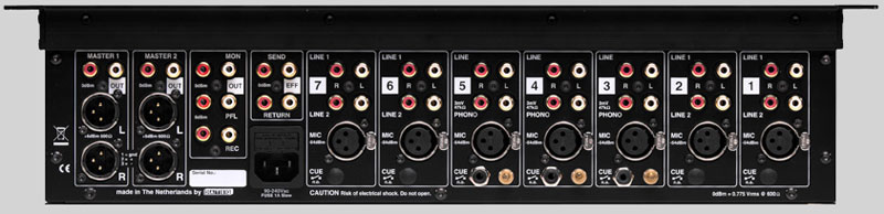 versatile, 7 channel analogue stereo mixer, each channel with 3 selectable inputs (mic, stereo line1, stereo line 2) with equalizer, 2 stereo masters, 19" rackmount