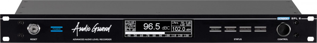 Audio Level Guard mit Mess-Mikrofon, regelbar über Threshold und Output, zum Verplomben, dB(A), dB(C) and dB-peak, 10-Band EQ und 10-Band Limiting, XLR in/out, 19" 1U