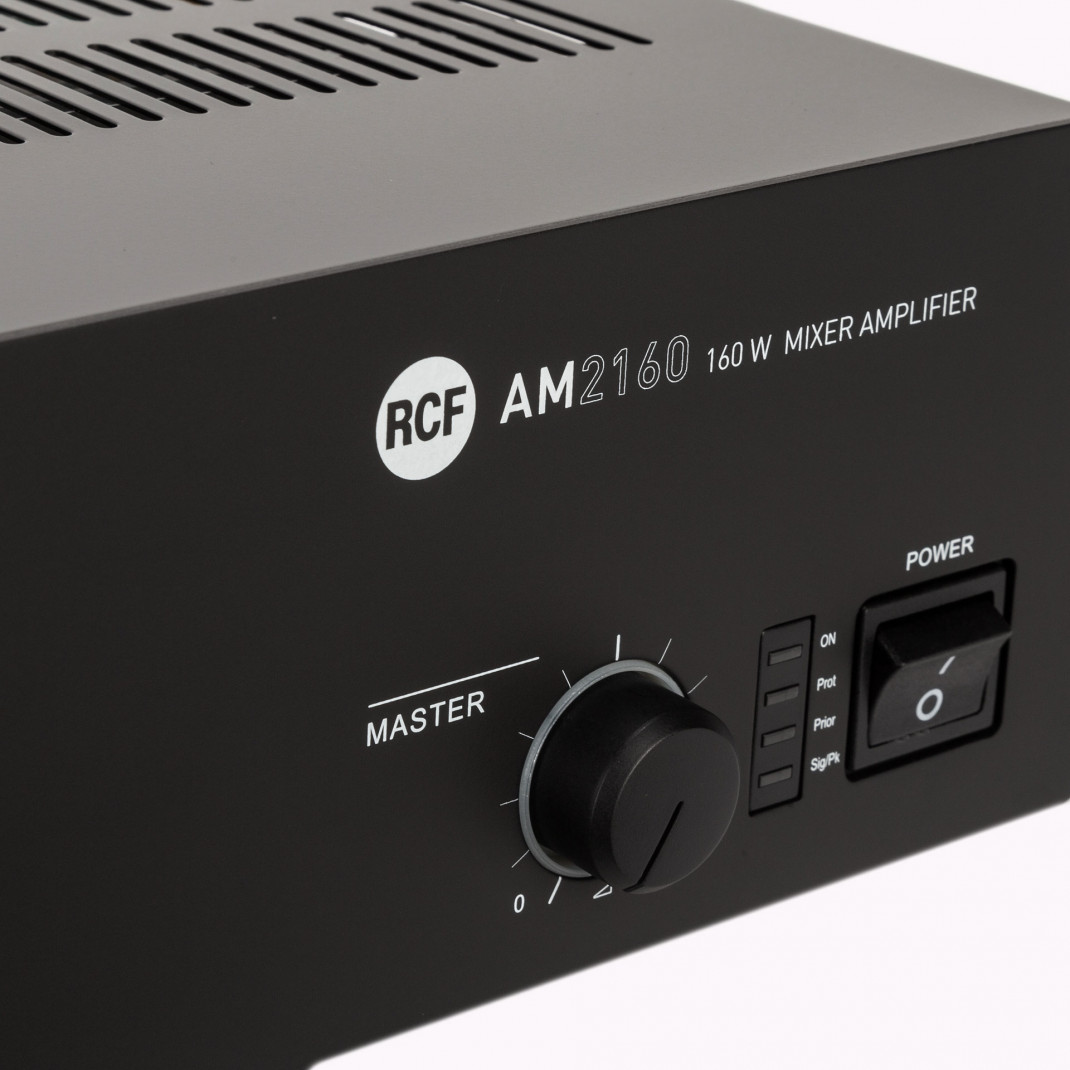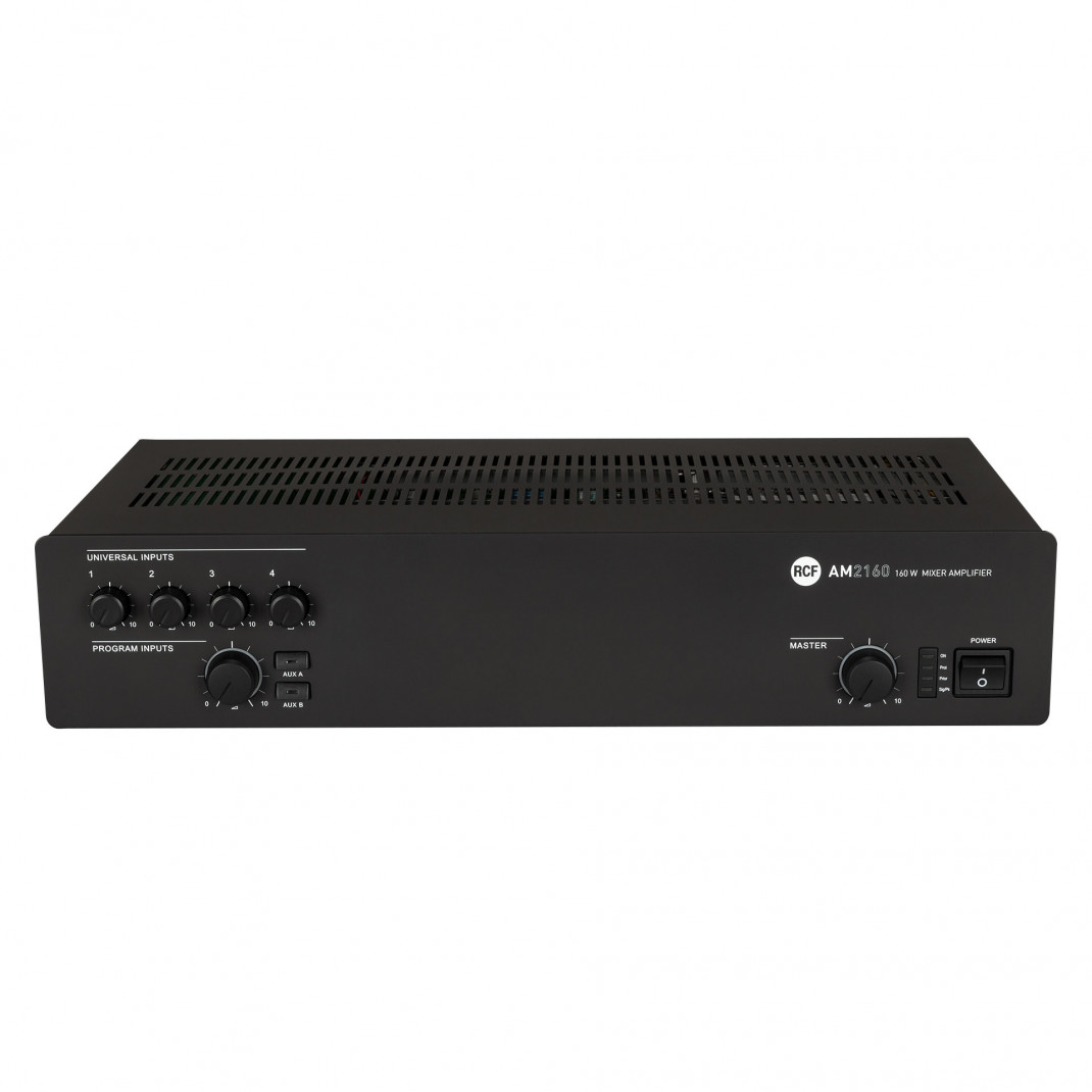 Der AM 2160 ist ein Mixer/Verstärker mit 4 Mikrofon-/Line-Audioeingängen über abnehmbare Stecker (der erste Eingang elles ist auch über XLR verfügbar) und 2 Aux-Eingängen für Musikquellen (CD-Player, Tuner usw.).Der Verstärker hat eine Nennleistung von 160 Watt. Der Ausgang des Verstärkers kann entweder Lautsprecher mit niedriger Impedanz (mindestens 4 Ω) oder eine Leitung mit konstanter Spannung von 100 - 70 V (für Lautsprecher mit Transformatoren 100 - 70 V) versorgen.