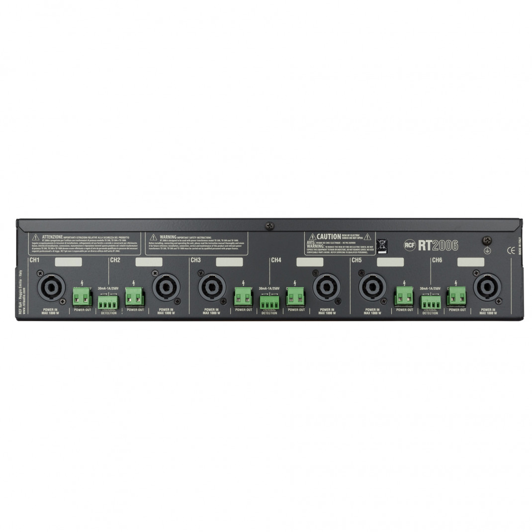 Die Rackschublade RT 2006 ermöglicht die Unterbringung und den Anschluss von bis zu 6 Transformatoren beim TD 300, bis zu 4 Transformatoren beim TD 500 und bis zu 2 Transformatoren beim TD 1000. Es ist auch möglich, Transformatoren mit unterschiedlicher Leistung zu kombinieren. RT 2006 verfügt über eine Leiterplatte mit Klemmen für den Anschluss von Transformatoren an Verstärker und Lautsprecherleitungen. Alle Anschlüsse (auf der Rückwand) sind abnehmbar und für die maximale Leistung dimensioniert. Der Anschluss der Verstärker erfolgt über SPEAKON-Anschlüsse. Der Anschluss der Lautsprecherkabel erfolgt über EUROBLOCK-Schraubklemmen. Die Schaltkreise für die thermische Erkennung des Transformators verfügen über potentialfreie Kontakte an Schraubklemmen.MERKMALE