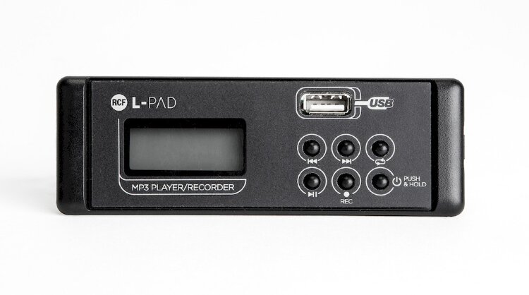 Mit der L-Pad Player/Recorder Card von RCF können Sie Ihren L-PAD-Mixer um einen MP3-Player erweitern, indem Sie ihn in den dafür vorgesehenen Steckplatz einstecken. Platzieren Sie Ihre bevorzugten MP3-Songs auf einem USB-Stick, gleichmäßig aufgeteilt in getrennten Ordnern, stecken Sie den USB-Stick in den dafür vorgesehenen Anschluss der Player Card und spielen Sie Ihre Musik über den L-PAD-Mixer ab, ohne ein weiteres externes Gerät. Nehmen Sie das Musikprogramm im Main Mix auf, indem Sie einfach die REC-Taste drücken. Dies ist ein ideales Zubehör, um Ihre Proben oder Gigs aufzunehmen.