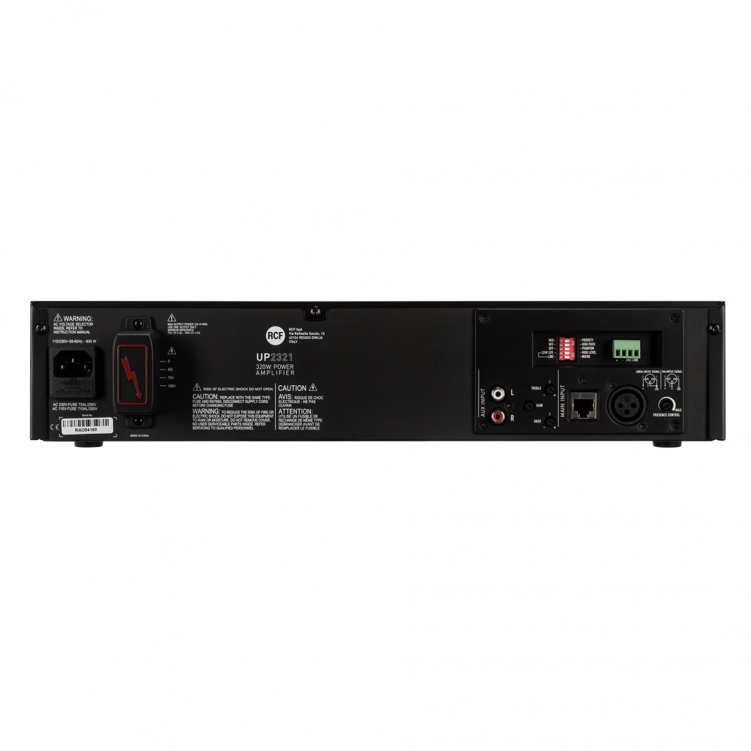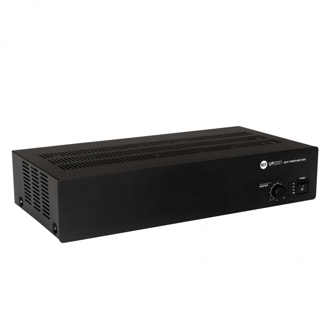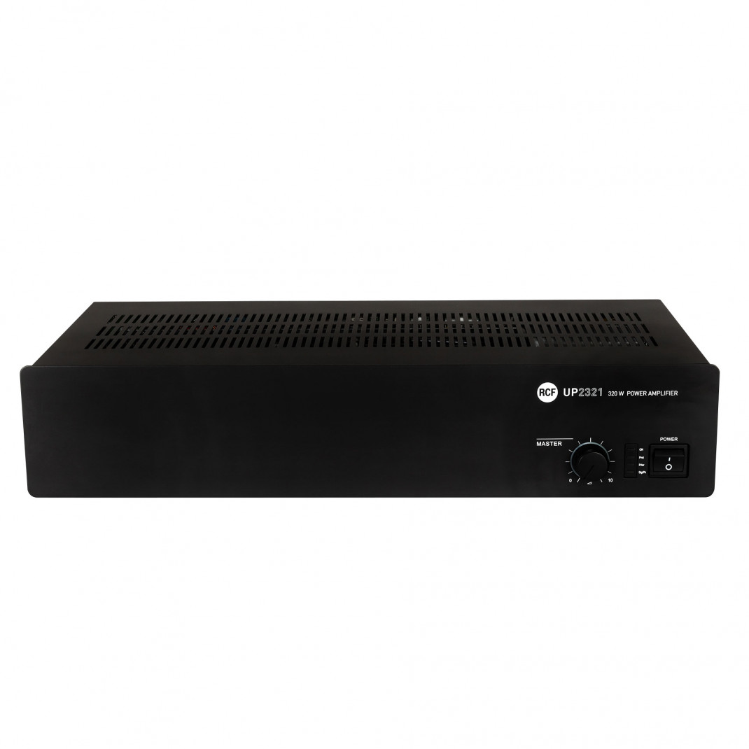 Der UP 2321 ist ein 320 W Leistungsverstärker für die Übertragung von Durchsagen und Musikprogrammen. Der Verstärker ist mit einem Haupteingang (Mikrofon/Line) mit abnehmbarem Stecker oder XLR oder RJ 45 und einem Hilfseingang für Musikquellen (z.B. CD-Player, Tuner, etc.) ausgestattet. Der Verstärkerausgang ist entweder für niederohmige Lautsprecher oder 100 - 70 V Konstantspannungsleitung verfügbar. Der Verstärker ist ein Class-D-Verstärker mit Schaltnetzteil; das Gesamtgewicht ist extrem reduziert und bietet eine hohe Audio-Bandbreite.MERKMALE