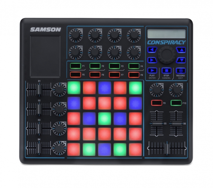 Samson's Conspiracy™ MIDI Control Surface lets you command your software with authority. Featuring an ultra-portable design and impressive array of customizable, tactile controls, the Conspiracy™ is the answer for producers/DJs, performers and mobile musicians looking to expand their creativity in live and studio production settings.The core of the Conspiracy™ is made up of 25 velocity-sensitive trigger pads with aftertouch for sequencing melodies and rhythms, as well as launching clips, loops and samples for live performance. The pads also feature 3-color backlighting, which enables more comprehensive visual feedback and less reliance on a computer screen. Additional control is provided by the Conspiracy's 14 endless encoders, 10 backlit function buttons and 6 precision faders. All of these controls can be custom assigned via a backlit LCD navigated by a master encoder and four directional buttons. From here, you can program the type (Note/CC#), mode (Momentary/Toggle) and MIDI channel number of the pads, knobs, faders and buttons. Finally, the Conspiracy's X/Y touch pad is especially adept at manipulating effects or transitions within applicable software instruments.