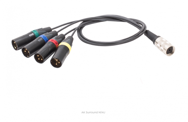 Für Surround-Aufnahmen mit bis zu sechs Kanälen (z.B. 5.1-Surround) gibt es die Kabel K Surround x M mit Multi-Pin-Steckern an beiden Enden ("x" entspricht der Länge in Metern). Das Adapterkabel AK Surround M/4U splittet dieses Multicore-Kabel auf vier XLR-3 auf. Es ist auch auch als AK Surround M/5U für fünf Kanäle erhältlich. Für die Verwendung von sechs Kanälen, gibt es die Splitterbox M/6U.Es ist auch mit Anschluss für Heizungsspeisung erhältlich (AK Surround H M/4U).