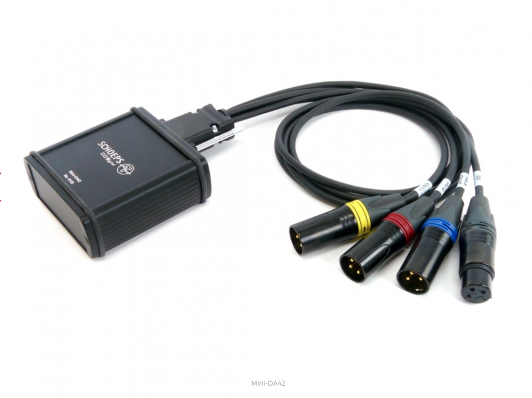 AES42 Powering Box mit digitalen und analogen Ausgängen. Set inklusive Mini-DA42 ohne Netzteil, Breakout-Kabel für Mini-DA42, PSD DC, Typ C (Eurostecker)