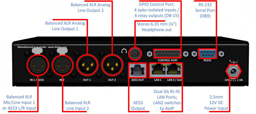 - IP (komprimiert): Opus, Tieline Music, Tieline MusicPLUS, G.711, G.722, MPEG Layer 2, AAC-LD, AAC-ELD, AAC-LC, AAC-HE, AAC-HEv2, 16/24 bit Enhanced apt-X*