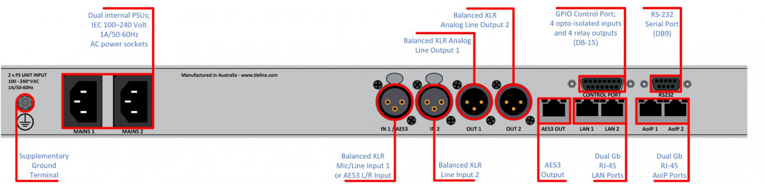 - IP (komprimiert): Opus, Tieline Music, Tieline MusicPLUS, G.711, G.722, MPEG Layer 2, AAC-LD, AAC-ELD, AAC-LC, AAC-HE, AAC-HEv2, 16/24 bit Enhanced apt-X*