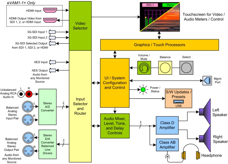 Der neue eVAM1-1+ ist ein gut ausgestatteter, einfach zu bedienender und preisgünstiger 16-Kanal-Basisband-Video- und Audiomonitor, der standardmäßig mit 3G-SDI (2 Eingänge), 1 HDMI I/O, AES3 (1 Paar) und analogen Ein- und Ausgängen (2 wählbare Paare auf XLR oder RCA) ausgestattet ist. Mit Touchscreen-Bedienung und 8 Voreinstellungen ist der eVAM1-1+ die perfekte Lösung für jede Anwendung, die ein kompaktes Produkt zur Überwachung von Basisbandsignalen erfordert.Merkmale und Vorteile