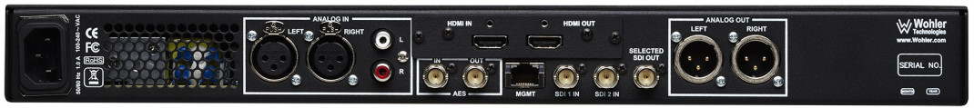 - 2 x 3G-SDI-Eingänge auf BNC mit ausgewähltem Ausgang auf BNC, 1 HDMI-Eingang/Ausgang mit ausgewähltem Ausgang von überwachtem SDI oder HDMI, 1 pr AES3-Eingang/Ausgang auf BNC, 1 pr symmetrischer analoger Eingang auf XLR + 1 pr unsymmetrischer analoger Eingang auf RCA