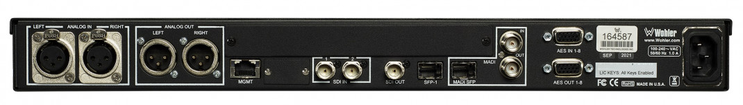 - Optionale E/A: für AES3 auf HD-15 (inkl. ausgewählter Audioquelle, die in AES3-Ausgang konvertiert wird), MADI auf BNC (durchgeschleift), und SMPTE 2110 oder SMPTE 2022 über SFP