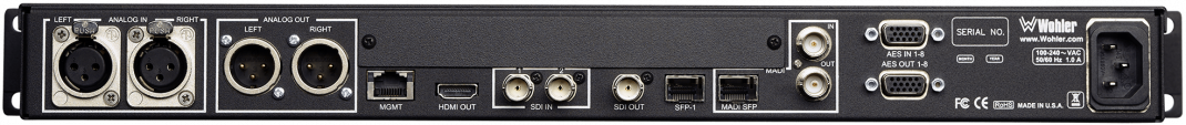 - Optionale E/A: für AES3 auf HD-15 (inkl. ausgewählter Audioquelle, die in AES3-Ausgang konvertiert wird), MADI auf BNC (durchgeschleift) und SMPTE 2110 oder SMPTE 2022 über SFP