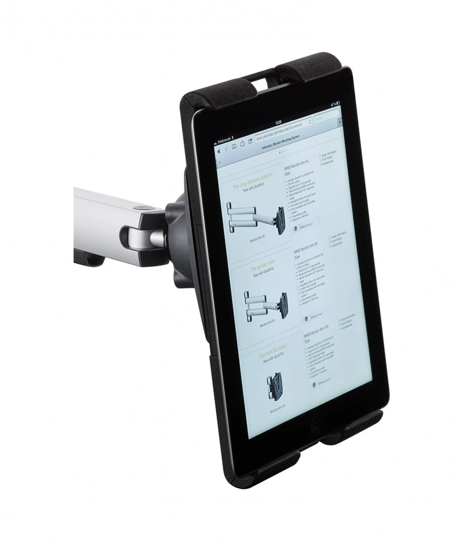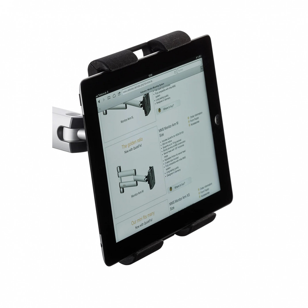 Mit m!ka Pad-Dock können Sie Ihren Tablet-Computer sicher befestigen. Machen Sie ihn im Handumdrehen zu einem unverzichtbaren Bestandteil Ihres Arbeitsbereiches. Wählen Sie einfach Ihren bevorzugten m!ka Monitorarm aus und befestigen Sie das m!ka Pad-Dock per QuickFix an Ihrem m!ka Studio-Setup. Um das Tablet richtig zu halten, muss die Seitenlänge 16-30cm betragen. Tablets passen sowohl im Quer- als auch im Hochformat.