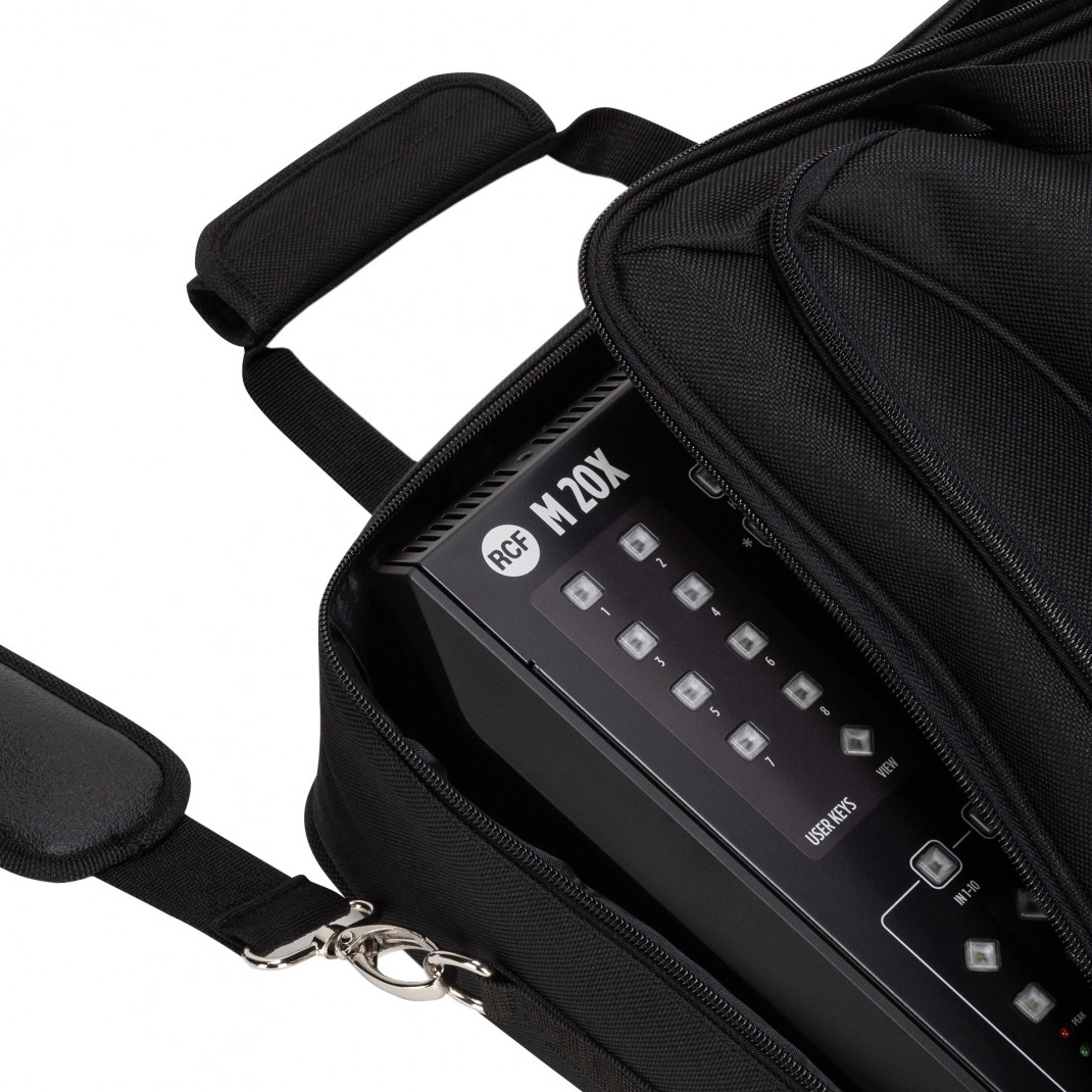 Sac de transport rembourré pour les mixeurs RCF M 20X et E 12 avec poignée et bandoulière. Large poche frontale avec compartiment séparé pour les tablettes ou autres accessoires.Spécifications