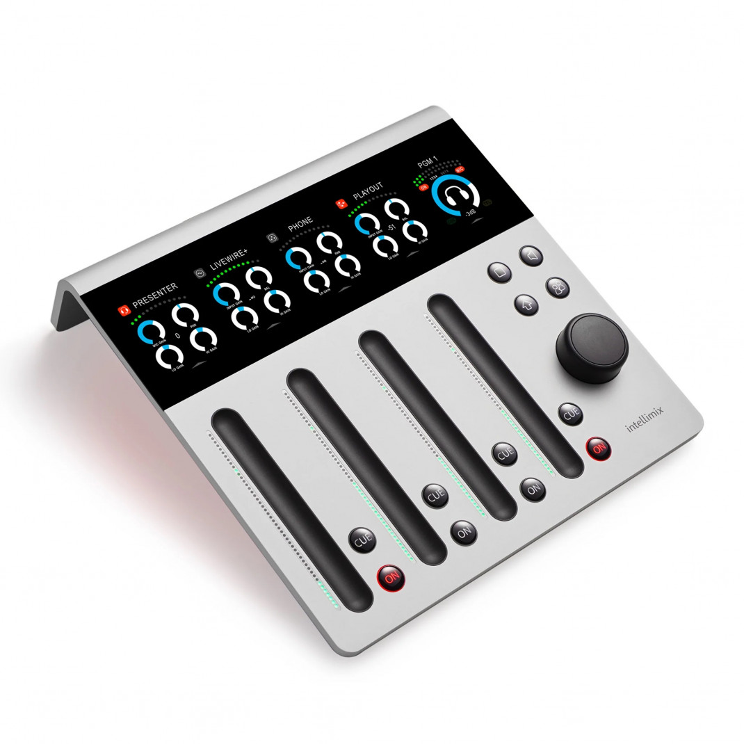 Intellimix PRO - 4 Fader Digital Desktop Mixer with G-Touch faders and His-Res TFT screen. Base unit with 3 XLR mic/line inputs, 2 XLR line inputs, 2 RCA line inputs, 3 AES iI/O's, 4 XLR line outputs, ADAT, DANTE, GPIO's